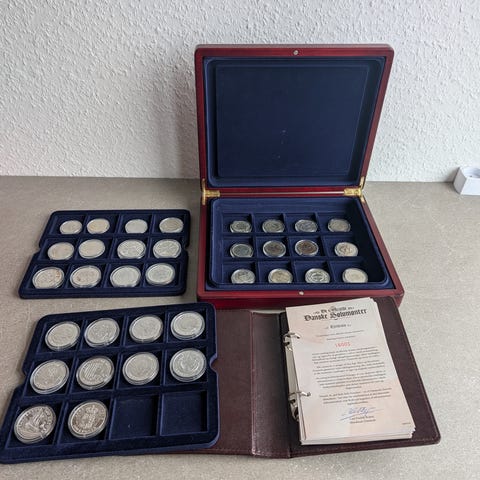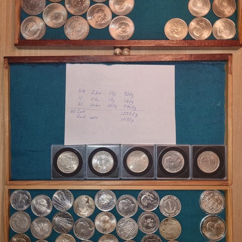 Samling af erindringsmønter fra Danmarks Nationalbank i sølv Motiverne omfatter blandt andet kronprins Frederiks 40 års fødselsdag 26. maj 2008, dronning Margrethe II’s tronbestigelse 15.01.1972 samt Christian IV 1588-1648. Mønterne leveres i kapsler og har forskellige motiver og årstal relateret til danske konger og nationale begivenheder. Velegnet til møntsamlere med interesse for danske erindringsmønter og dansk historie.
