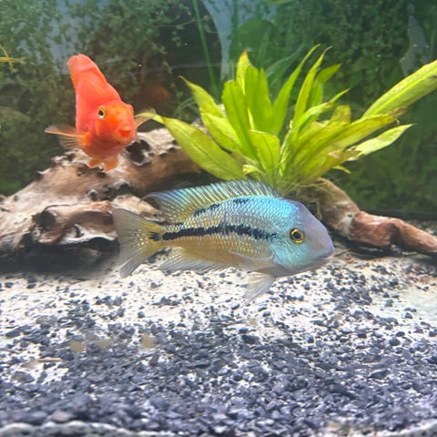 Der er en enkelt han tilbage i akvariet. Størrelse ca 12 cm. Købt som Andinoacara pulcher "Electric Blue" Svarer helst på mail eller sms