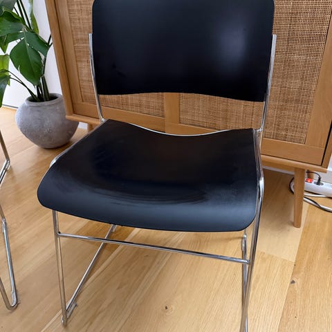 Howe 40/4 EXTRA stolen, designet af David Rowland, i sort finér er et ikonisk møbel med et enkelt og minimalistisk udtryk, god ergonomi og praktisk stabelbarhed. Den egner sig både til møde- og konferencemiljøer samt som spisebordsstol i det moderne hjem, hvor den forener komfort og funktionalitet på en måde, der fortsat tiltaler arkitekter og designbevidste.