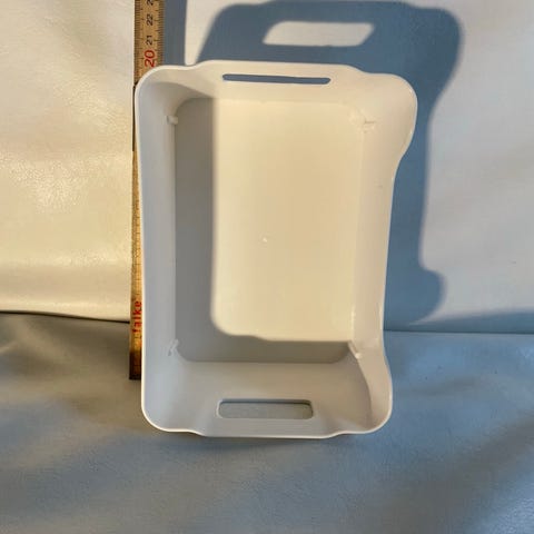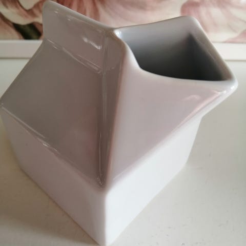 Kande i hvid plastik beregnet til en mælkekarton, den er rigtig god og handy i brug.