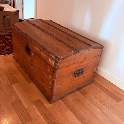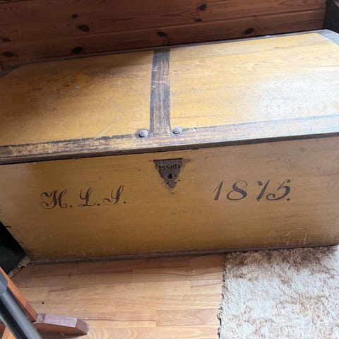 Træ kiste i malet udførelse. Kisten er udvendigt grøn med røde dekorative felter og bemaling på fronten. Den har buet låg, sidehåndtag i metal og hængsler indvendigt. Indersiden står i naturtræ med synlige brædder. Velegnet til opbevaring af tekstiler, legetøj eller andre genstande, eller som dekorativt møbel i bolig, sommerhus eller lignende. Mål. H 77 - l 140 d 57.