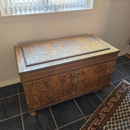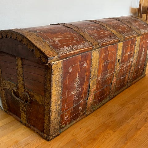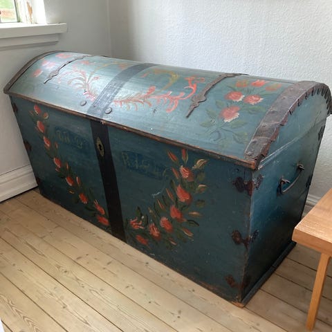 Træskrin / kiste med buet låg og håndmalet dekoration på sider og låg. Kisten er udført i træ med jernbeslag og metalhåndtag i siderne. Indvendigt er der et rummeligt opbevaringsrum egnet til opbevaring af tekstiler, pyntegenstande eller andre genstande. Kisten står på lille sokkelkant og har hængslet låg med indvendig støttearm.