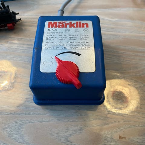 Märklin togbane med 2 lokomotiver, 13 godsvogne, 2 passagervogne, trafo, håndskiftespor, tilslutningsskinne, lige og buede skinner og skinnekryds. Lokomotiver virker som de skal, det sorte har lys foran og det røde har lys i begge ender. Det hele er i pæn stand, enkelte vogne med små mangler/patina. Der mangler et hjørne af taget på det røde lokomotiv. Se billeder for stand m.m.