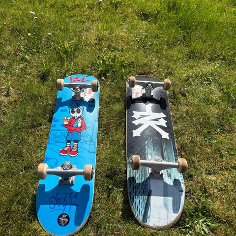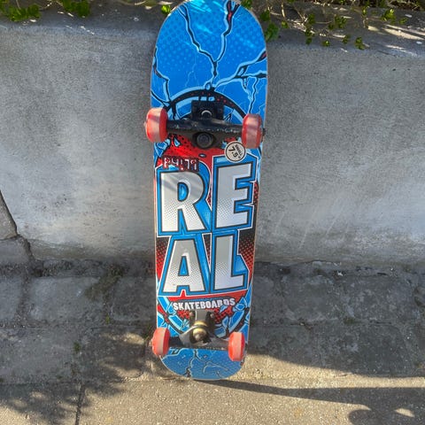 Brættet er monteret med store Kryptonics-hjul, to røde og to blå. Bygget til lidt slalom eller fri leg.