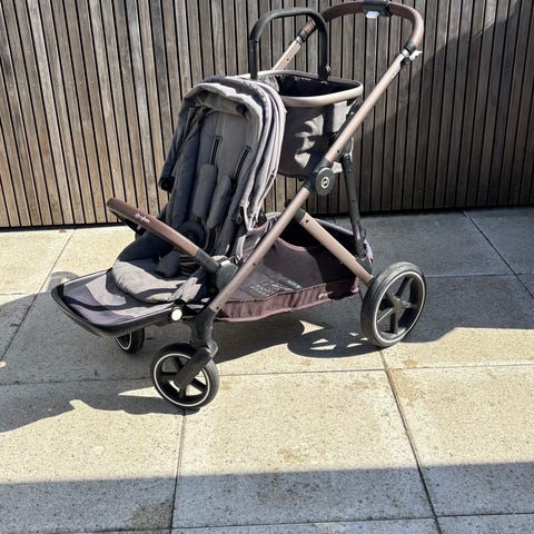 Cybex e-Priam klapvogn i sort. Fra 2019. Vognen har drejelige forhjul og større baghjul, justerbart sæde og kaleche samt ekstra stor indkøbskurv under sædet. E-funktion der giver elektrisk hjælp ved terrænmæssige stigninger, når slået til. Obs brugsspror, hhv: en del slitage på styr, lille hul i indkøbskurven (dog uden betydning for funktionalitet) samt solskade på kaleche. Der medfølger originalt Cybex- regnslag, parasol med flere justeringspunkter og kopholder.