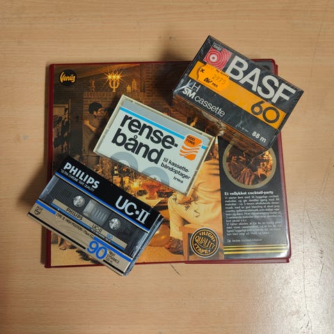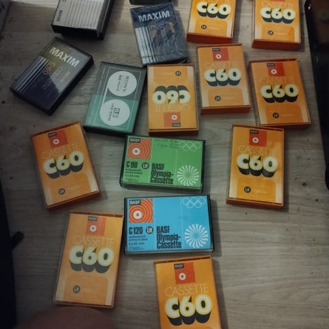 kassettebånd i plastikæsker. Flere bånd samlet i én kasse, nummereret på ryggen. Velegnet til lydoptagelse og afspilning på kassettebåndoptagere, f.eks. til musik, tale eller arkivering af optagelser. Kassettebåndene er type I (normal position) med 90 minutters spilletid. 15 kr pr stk giv et bud
