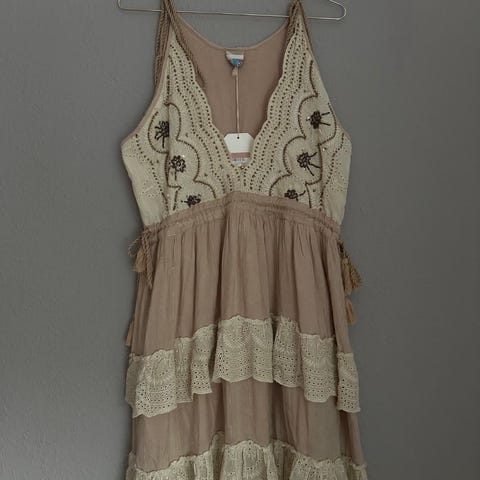 beige, silke, Næsten som ny, kjole/dress med flotte detaljer, Kun brugt en gang. Længde: 195 cm, brystvidde ca. 92/94, hofter: 102 cm, lynlås i siden, underkjole. Str. 40. Nypris 999 kr.