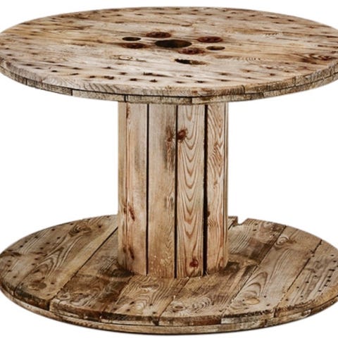 Kabeltromle med hjul Højde med hjul 75 cm. Bredde: 100 cm. Dybde: 100 cm. kan bruges som spisebord eller som udstillingsplatform i butik med varer på