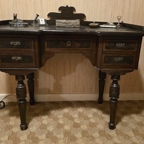 Ukendt mærke antikt skrivebord med stol og sybord i træ