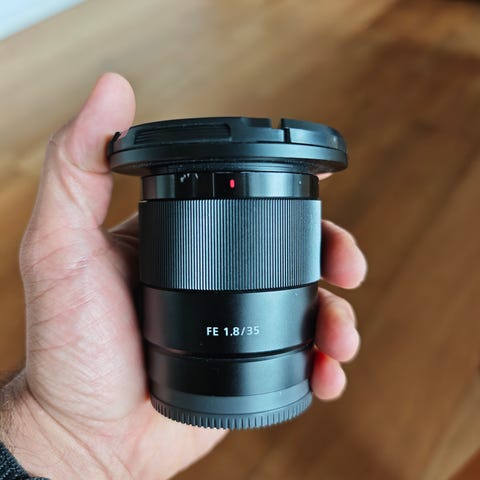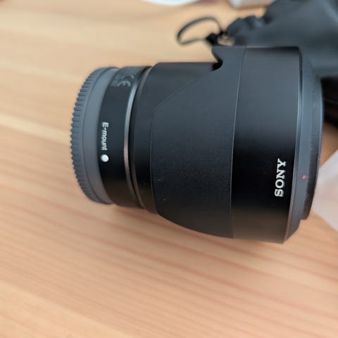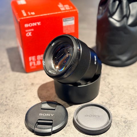Sony FE 85mm f/1.8 objektiv i sort. Fast teleobjektiv til Sony full-frame E-mount kameraer, egnet til blandt andet portrætfotografering. Objektivet har autofokus med AF/MF-knap på siden. Leveres med modlysblænde som vist på billederne samt UV filter.
