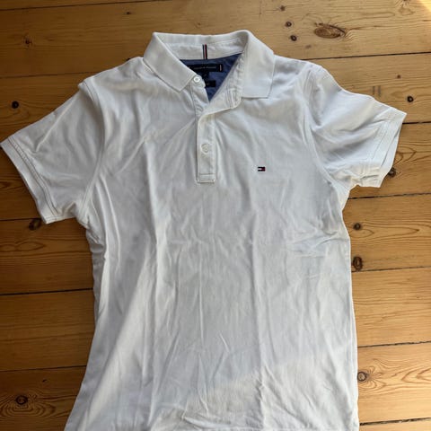 Hollister stribet polo T-shirt til herre i størrelse L. T-shirten er hvid med tynde, vandrette striber og har kortærmet design. Materialet er bomuld. Foran er der Hollister-logo broderet på brystet. Måler 72 cm i længden og 49 cm fra ærmegab til ærmegab.