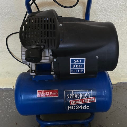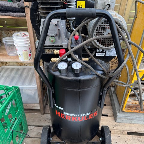 Primax kompressor. Bærbar elektrisk kompressor med håndtag og manometre på toppen til regulering og aflæsning af tryk. Egnet til trykluftsopgaver som fx oppumpning og brug af mindre luftværktøj i værksted eller garage. Nærmere tekniske specifikationer som effekt, tankvolumen og arbejdstryk fremgår ikke af billedet og bør kontrolleres på typeskiltet på enheden.