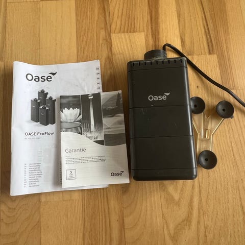 Oase EcoFlow 100 akvariepumpe i sort. Pumpe med strømtilslutning 230 V / 50 Hz. Har sugekopper på bagsiden. Velegnet til akvarier op til 100 l.