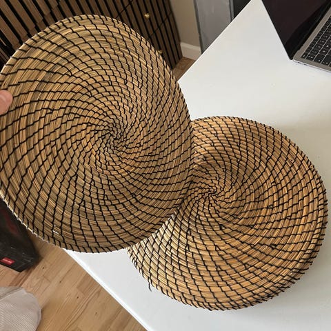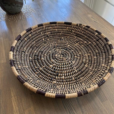 Mønstrede fletkurve fra Ghana med vægophæng. Kan både bruges som vægdekoration eller til bordet.