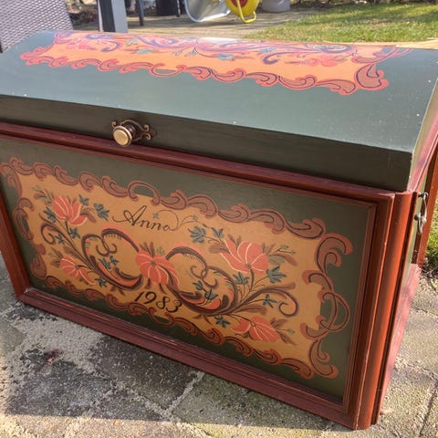 Tobaksskab, bemalet. Dateret 1791, men antageligt yngre. H. 63, B. 53, D. 25 cm.