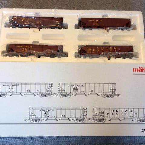 Märklin USA godsvogns sæt 4863. Til 895. Kr. og det indeholder 5 godsvogne hvor flest er metal vogne