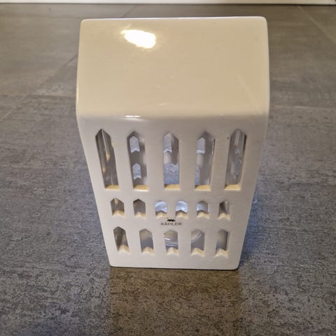 Kähler Urbania lyslygte i hvid glaseret keramik. Lygten har aflange, lodrette udskæringer i siderne, som lader lyset skinne ud. Egnet til fyrfadslys eller små bloklys. Velegnet som dekoration i hjemmet, på bordet eller i vindueskarmen.