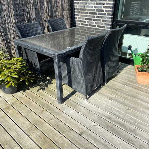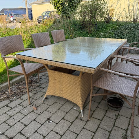 Havebord med rektangulær glasplade og tilhørende fletstole. Sættet består af et bord med stel i fletlook og glasplade på toppen samt flere matchende stole, som kan skubbes ind under bordet. Velegnet til udendørs brug på terrasse, altan eller i have. Stole leveres med hynder. Materialet er et plastflet/kunstflet-lignende materiale, der er egnet til udemiljøer. 118 x 118 cm