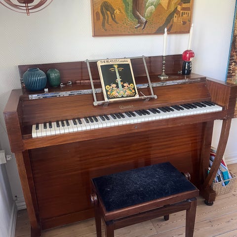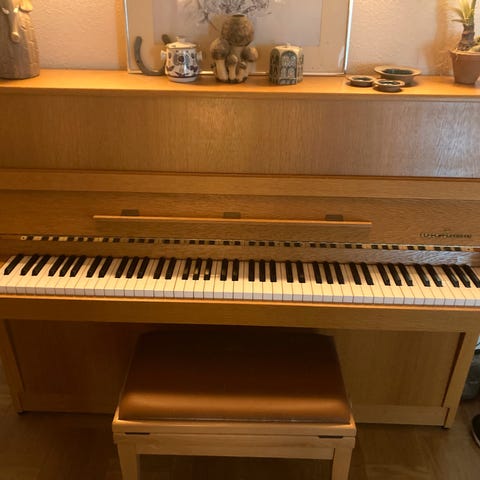 Upright klaver med klassisk træfinish. Standard klaviatur med 88 tangenter og to pedaler. Egnet til øvning derhjemme, musikundervisning eller som instrument i stue eller musiklokale. Træskab med lukket overdel og nodestativ integreret i låget.