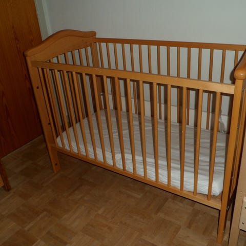 Tremmeseng i træ, brugt til 1 barn.