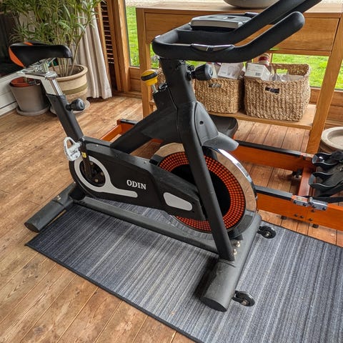 Odin motionscykel med integreret styr og saddel på justerbar stang. Cyklen har indbygget display til visning af træningsdata samt pedaler med rem. Egnet til indendørs konditionstræning i hjemmet.