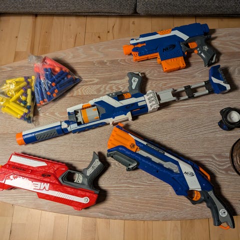 Nerf og x-shot legetøj med magasiner og skumpile. Sættet omfatter både mindre håndholdte pistoler og større geværer. Geværet med sigtekikkert er batteridrevet.