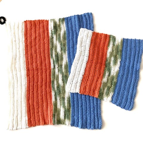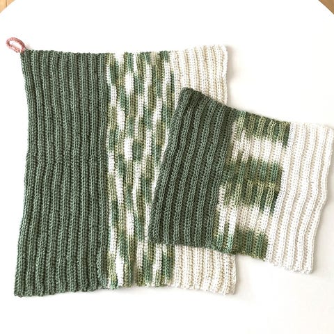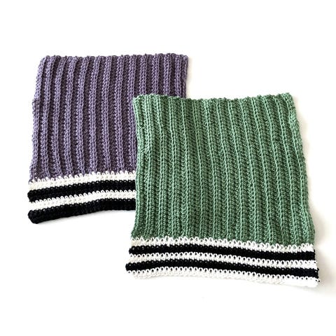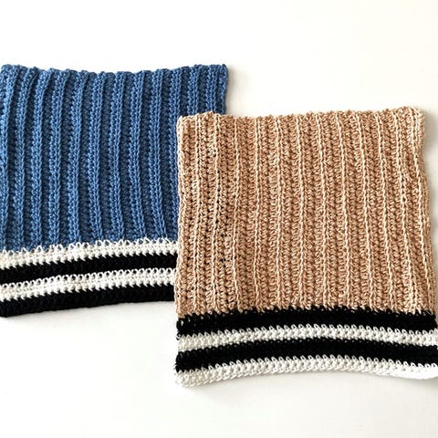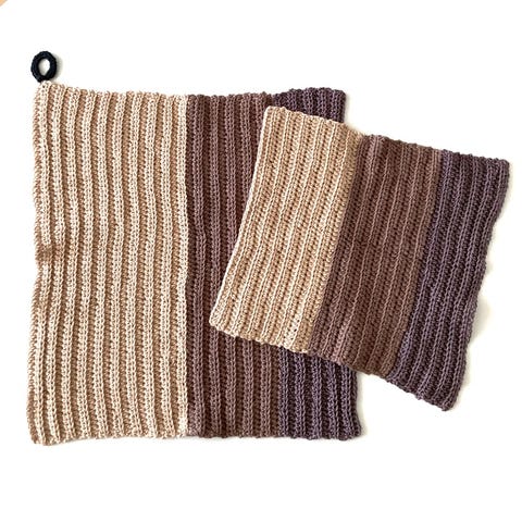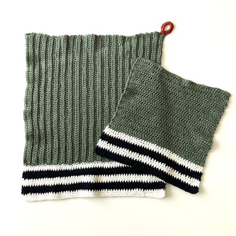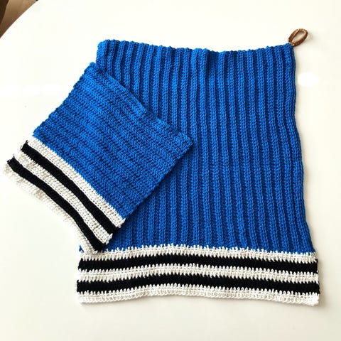 Helt nyt og ubrugt hæklet køkkensæt - gult m/sorte og hvide striber.