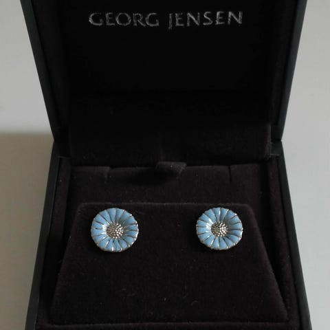 Georg Jensen Daisy ørestikker i forgyldt Sterling sølv. Den ene ørering har 2 afslag i den hvide emalje - jeg synes ikke det ses på lidt afstand