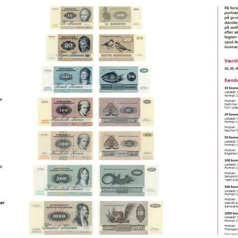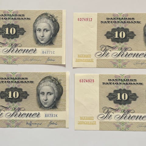 Danmarks Nationalbank ældre danske pengesedler i forskellige værdier. Sættet omfatter blandt andet 10-kronesedler, 50-kronesedler, 100-kronesedler og 200-kronesedler med motiver som fugl, fisk, sommerfugl og portrætter. Sedlerne er fra tidligere danske seddelserier og egner sig til samling, reference eller undervisningsbrug om dansk mønthistorie og pengesedler.