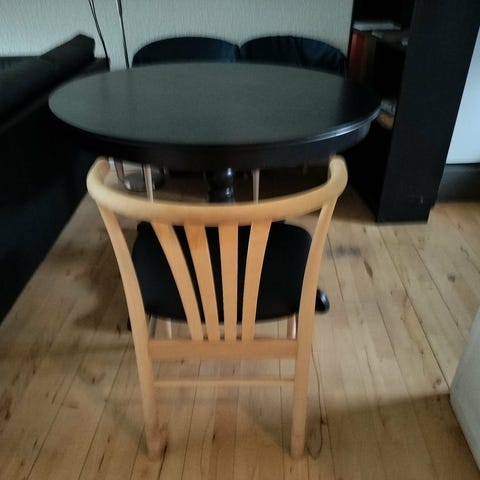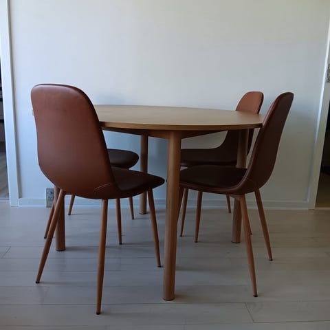 Næsten helt nyt spisebord med 4 matchende stole. Det er købt i Daells Bolighus og er af mærket Shape - se evt. sidste billede, men det er i lys træfarve. Bordet har næsten ikke været brugt, mens stolene er blevet slidt bagpå, men ser generelt fine ud foran. Sælges samlet.