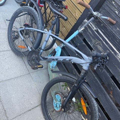 Mustang drengecykel. Trænger til en kærlig hånd men kørte fint sidste sommer. Baghjul fladt.