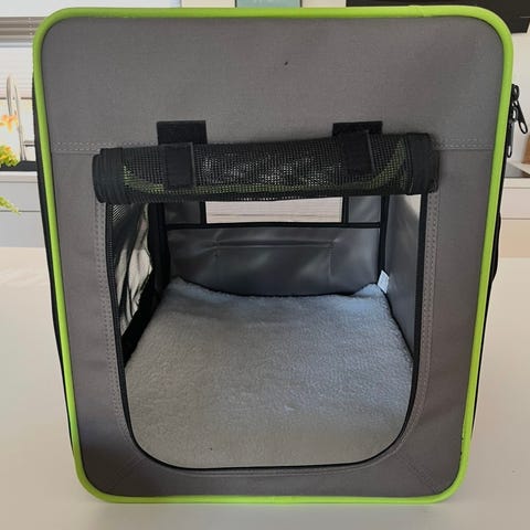 Indvendigt ses en blød bundpude for øget komfort til dyret. Egnet til mindre kæledyr som hund eller kat ved transport i bil, offentlig transport eller som midlertidig hvileplads i hjemmet.