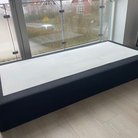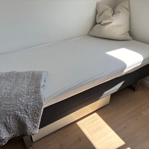 IKEA Stavanger seng. Sengen har en polstret ramme med mørkt stof på sider og top samt lyse paneler på siderne. Bunden består af lamelbund i træ. Modellen er egnet som seng i soveværelse eller gæsteværelse. Nypris 4200. Topmadras medfølger hvis lyst. Der altid brugt topmadras på sengen, ca 3 gammel, let brugt. 200/80cm