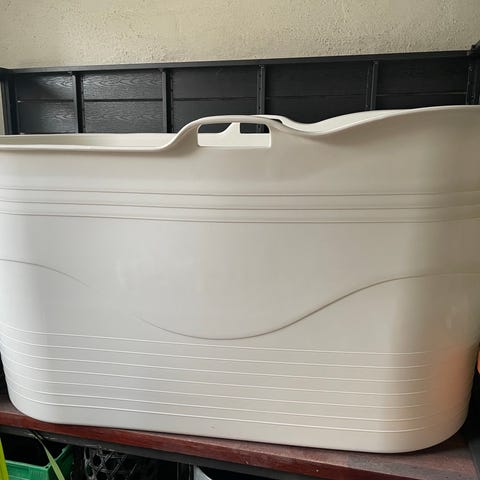 Sæt bestående af badekar og håndvask med tilhørende sokkel i blå farve. Badekarret er rektangulært med afløb i den ene ende. Håndvasken er væghængt med hul til armatur og overløb, og der medfølger en separat sokkel i samme blå farve til montering under vasken. Velegnet til badeværelse, bryggers eller lignende rum, hvor der ønskes sanitet i matchende farve.