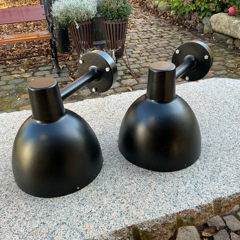 To flotte Toldbodlamper med Louis Poulsen. Har været rundt om maleren, malet matsorte udvendigt og hvide indvendigt. Nye skærme. Pris pr. stk. kr. 3.350,- .