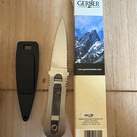 Gerber Clip Lock Rivermaster kniv med original sort plastskede. Kniven har fast blad med delvist savtakket ryg og bælteclip på skaftet i metal. Sættet inkluderer den blå/sorte Gerber "Legendary Blades" æske. Velegnet som brugskniv eller samlerobjekt, hvor både kniv, skede og æske indgår som komplet sæt. Helt ny aldrig brugt kom med et bud