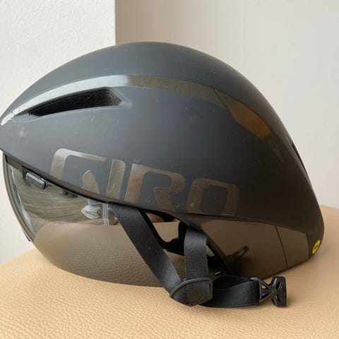 Cykelhjelm, Giro Air attack, 750 DKK! Lækker Giro Air attack model med lav vægt og vindmodstand. Flot stand brugt meget lidt se indvendigt billede. Skærm over øverste del af ansigt. Str Large 59-63 cm. Ca 300 gram. Sort mat overflade og sort højblankt Carl Zeiss Vision med røgfarvet visir.