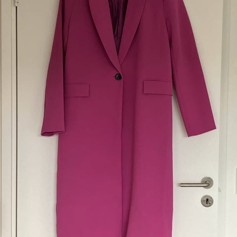 Max Mara frakke til kvinder i str. M. Lang, rød uldfrakke med reverskrave og knaplukning foran. Modellen har bindebælte bagpå og er helforet. Velegnet som overtøj i køligere sæsoner.