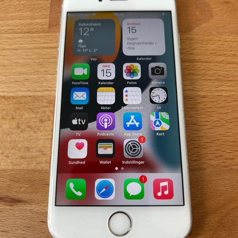 Apple iPhone iPhone 6 smartphone med 64 GB intern hukommelse. Modellen har Touch ID-hjemknap på forsiden og kamera med blitz på bagsiden. Enheden har Lightning-port til opladning og data samt fysisk lydstyrkeknapper og lydløs-knap på siden. Farven fremstår som hvid/front med lys bagside. Velegnet til almindelig brug som opkald, beskeder, apps og internet med iOS-styresystem.