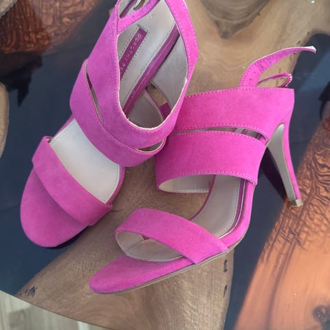 Sandaler i str. 37. Åbne sandaler med hæl og ankelrem. Flerfarvet design med blandt andet gul, pink og grøn. Overdel og hæl i ruskindslignende materiale, indersål i lyst materiale. Lukning med lille spænde ved anklen. Velegnet som sommersandal eller til brug ved festlige lejligheder.