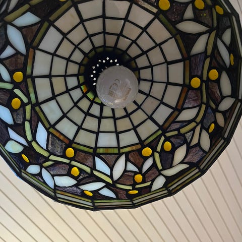 Smukkeste Tiffany-agtige loftslampe i lilla/blå farver med blomster. Kan afhentes i Odense C eller leveres inden for rimelig afstand herfra.
