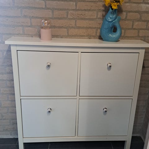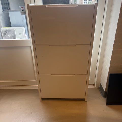 Helt nyt! skoskab med 3 rum i hvid. Skabet måler ca. 65 cm i bredde, 100 cm i højde og 26 cm i dybde. Velegnet til opbevaring af sko i entré eller garderobe, hvor det smalle mål gør det egnet til mindre rum. Skabet leveres som skoskab med klaprum til organisering af fodtøj.