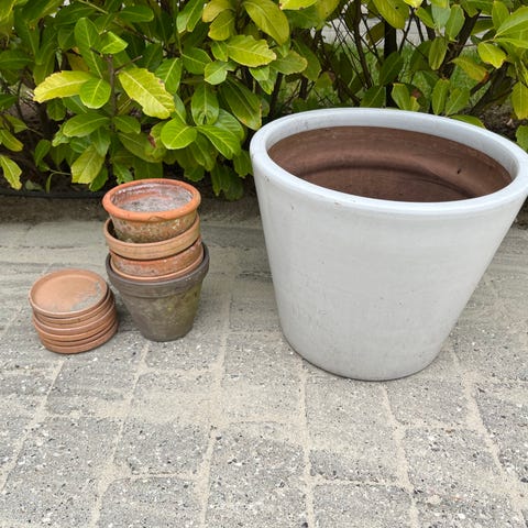 Samling af forskellige urtepotter og krukker i keramik og terrakotta i blandede størrelser og farver. Der er både mindre og større potter, herunder klassiske terrakottakrukker, glaserede keramikpotter i lyse og mørke nuancer samt enkelte dekorative krukker. Velegnet til omplantning af potteplanter, krydderurter eller dekoration både inde og ude, afhængigt af den enkelte pots materiale og stand. Flere af potterne har synlige brugsspor og jordrester. Sælges samlet som blandet parti for 100,-