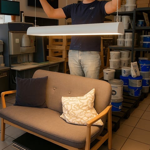 Lysstofarmatur ombygget til led 3x15,6 W farve 830. Lampen der lyser både op og ned. Brugt i garage, men passer fint til kontor - gildesal - hal - værksted. Giver et fantastisk godt lys. Længde 145 cm Bredde 34 cm Højde 22 cm