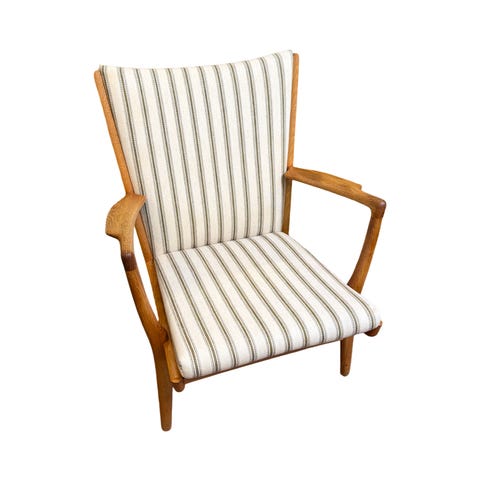 Fritz Hansen lænestol designet af Hans J. Wegner. Stolen er udført i træ med armlæn og høj ryg. Sædet er flettet i naturfarvet materiale. Egnet som lænestol eller hvilestol i stue, læsehjørne eller lignende indretning.