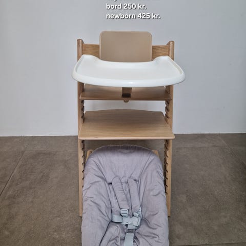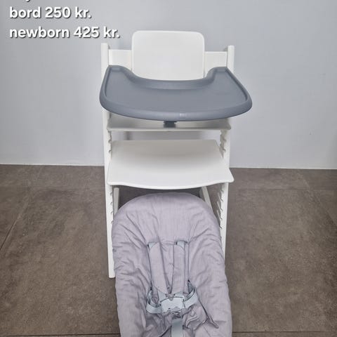 Newborn og plastikbøjlesæt passer på denne stol.