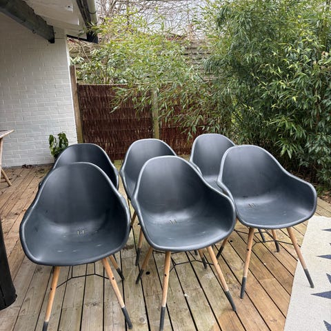 Have spisebordsstole i sort polyrattan. Stålramme med armlæn og flettet sæde og ryg. Velegnet til udendørs brug på terrasse, altan eller i haven. Stablbare stole, som gør dem nemme at opbevare, når de ikke er i brug.