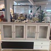 Lyst træskab med glaselementer til opbevaring samt åbne hylder, ideelt til stuen eller køkkenet.- Bemærk at mail, chat og beskeder ikke besvares, og varen skal købes på knappen "Gå til varen". Efter reservering af varen har du 10 dage til at afhente den i den butik, varen er på lager i.