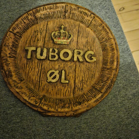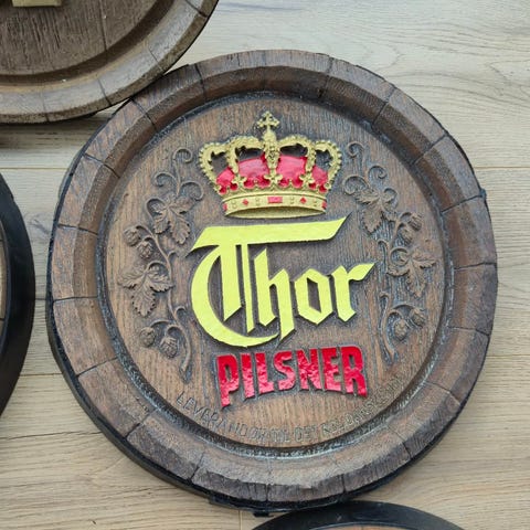 Dekorativt vægskilt af “træ”, der forestiller et ølfad, med logoet for Thor Pilsner og teksten "Leverandør til det kgl danske hof".
