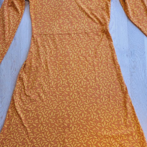 Gudrun Sjödén kjole S. Næsten som ny. 100% viscose jersey, falder godt. Længde 93cm. Bryst 45cm. Hofte 50cm. Nederst 62cm. Ærme indersøm35cm. 2 lommer i sidesømmen. Læg midt for. Vejer 275g.